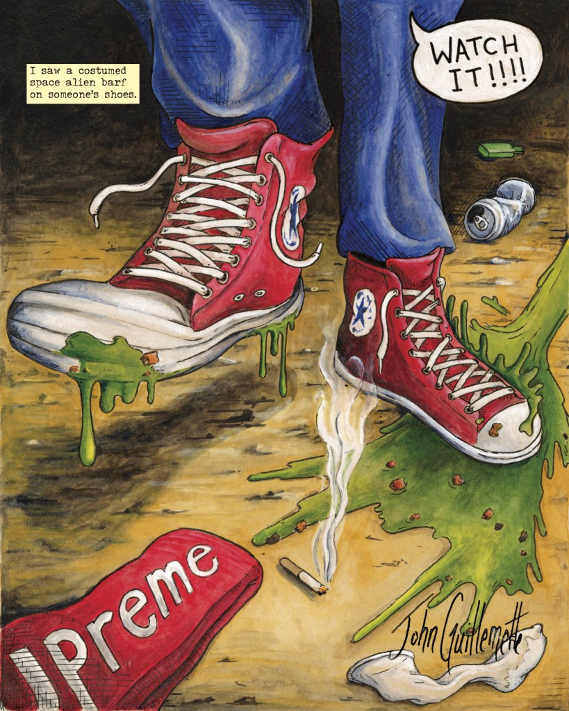 John lives in New Haven, Connecticut, where he strives to create weird comics both compulsively readable and infinitely layered. He describes his audience as “people you regret getting into conversations with at parties.” (Are you one such person? He hopes so.)