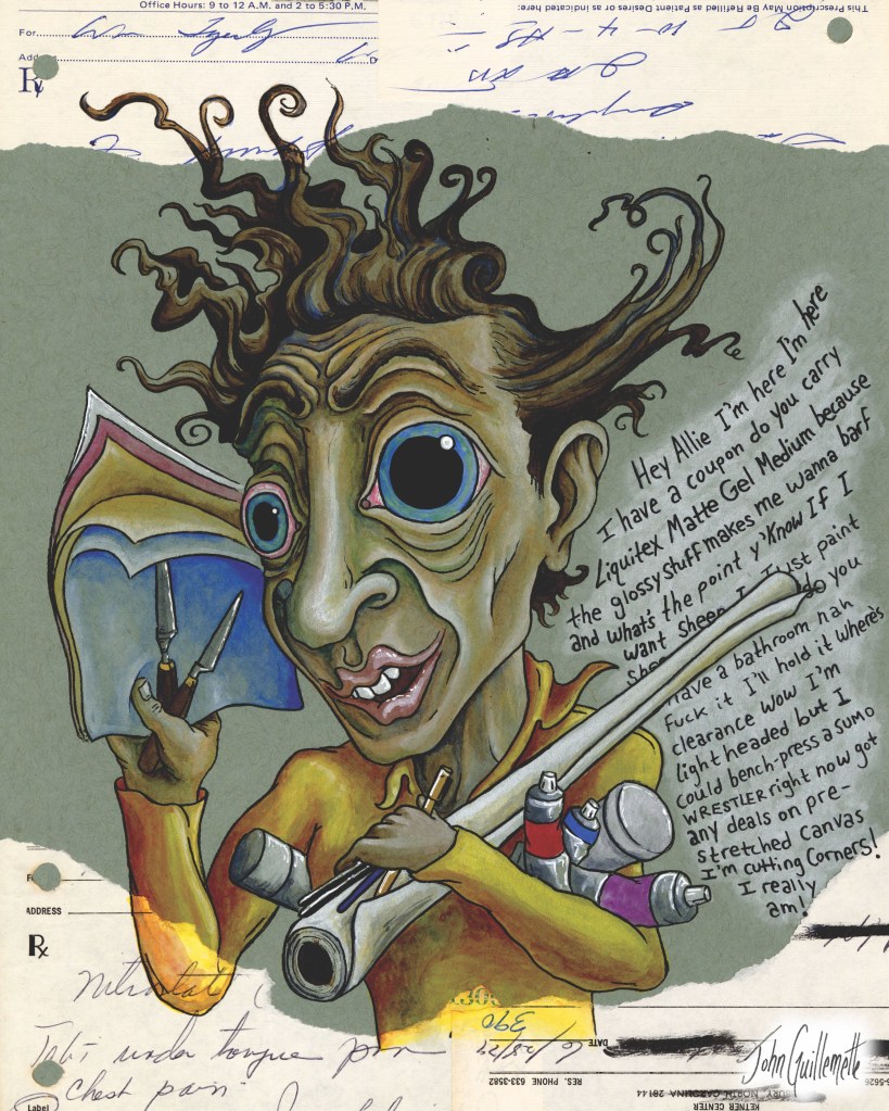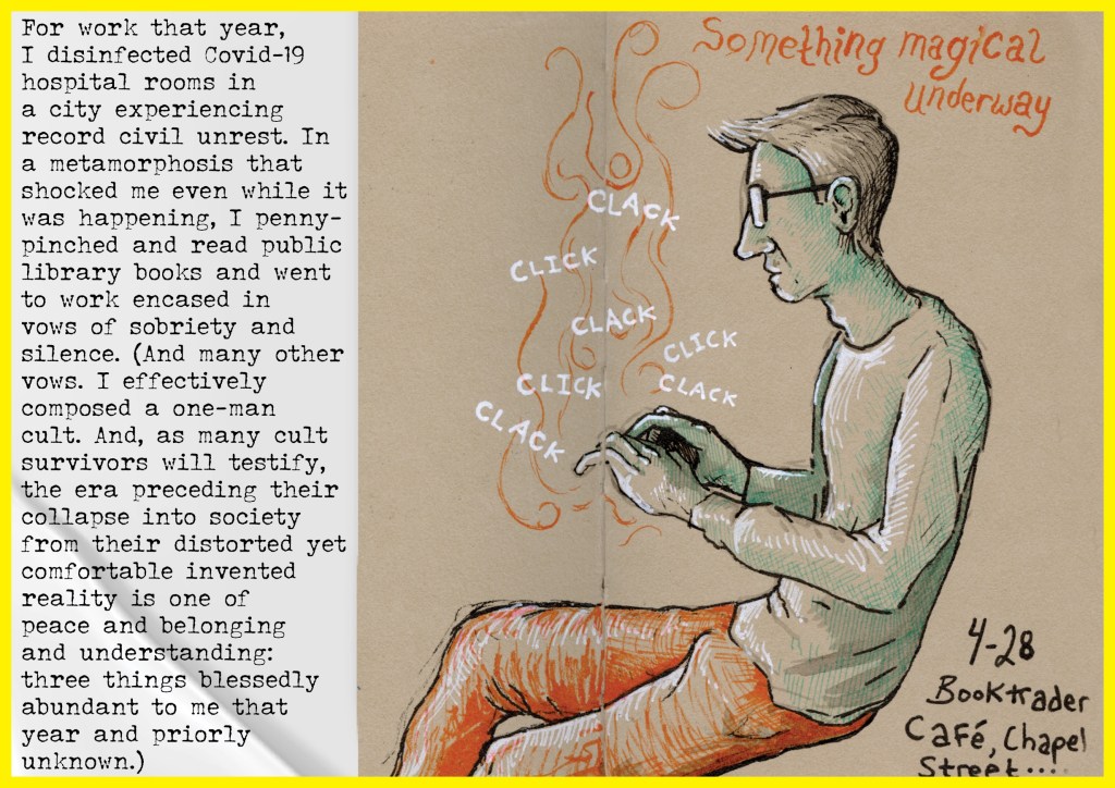 In this surprisingly lucid zine, John threads his creative philosophy through selected sketchbook pages, reflecting on his time in the looney bin, rehab, and eventually in Portland Oregon, where he spent the peak of the coronavirus pandemic disinfecting hospital rooms in the ICU five days a week (and yet was still somehow broke as a loafer). This project serves as an overture to his spiritually-warped graphic novel-in-progress, “Relapse of a Recovering Ego Addict.” Print copies contain two bonus comics and are available at New Haven’s zine fairs and arts pop-ups, or whenever you can flag John down on his bike. Otherwise, click the button below to view the project in full.